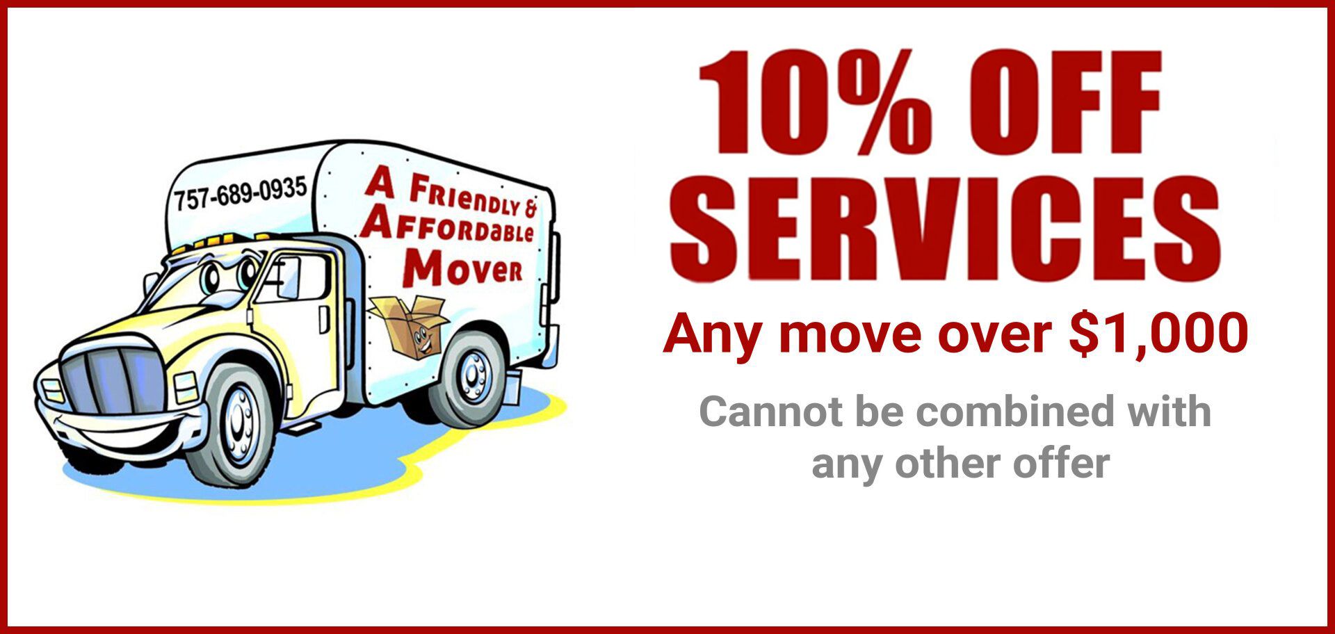 A Friendly & Affordable Mover in Virginia Beach, VA, can be reached at 757-689-0935.